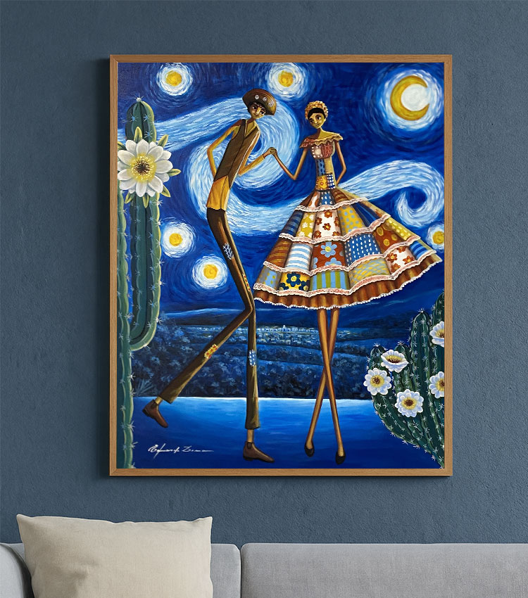 Os personagens alongados e elegantes, típicos do estilo de Eduardo Lima, vestem trajes que remetem às tradições do São João, com tecidos coloridos e estampas de retalhos, simbolizando a riqueza cultural do povo nordestino. A união entre Van Gogh e o forró não é apenas estética, mas conceitual: ambos expressam a beleza que surge da simplicidade e da emoção genuína. Assim, a obra celebra o encontro entre o sonho universal da arte e o orgulho regional do Nordeste, criando uma ponte entre o céu da Europa e o chão do sertão brasileiro.