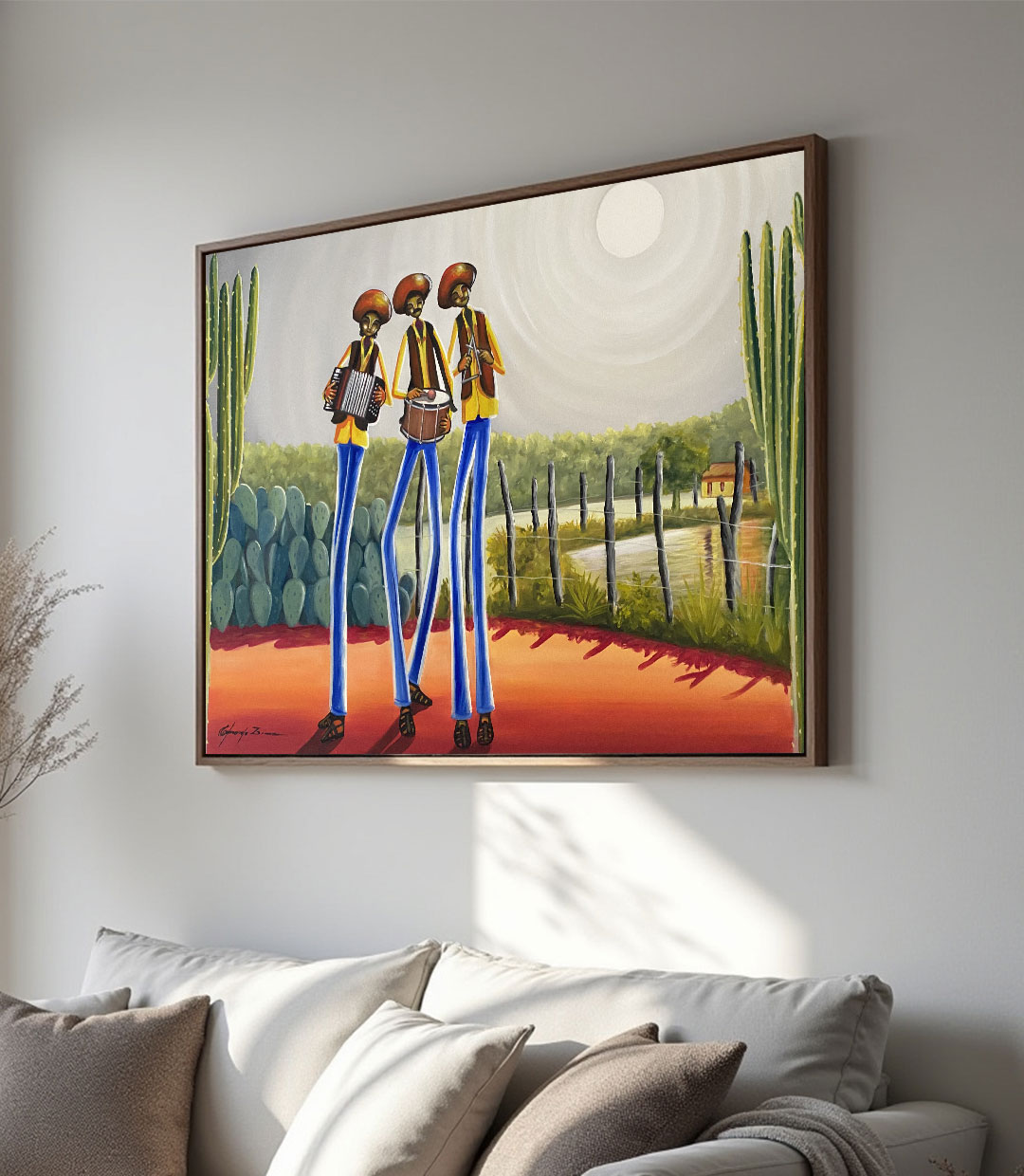 Na obra Forró no Sertão, Eduardo Lima homenageia a alma festiva do Nordeste com sua linguagem visual inconfundível. Três músicos de pernas longas — no estilo “delgados” — animam a paisagem árida com acordeon, zabumba e triângulo, formando um clássico trio pé-de-serra. Os personagens se projetam com elegância sob o sol branco do sertão, entre cactos e cercas de arame, enquanto suas roupas vibrantes e chapéus de couro ecoam a tradição do forró e o orgulho nordestino.