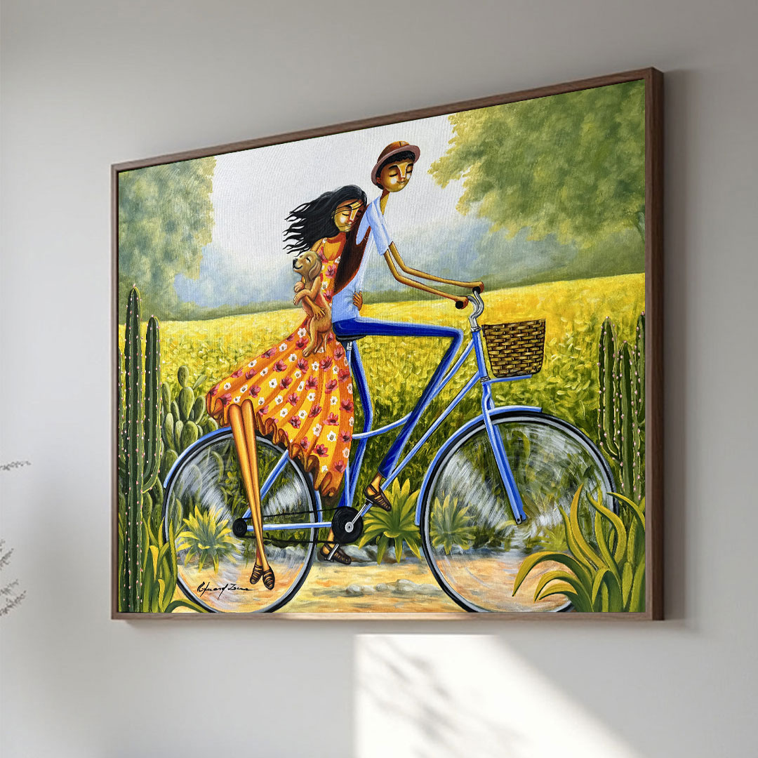 A obra Pedalando entre flores amarelas de Eduardo Lima é um retrato poético do cotidiano sertanejo que traduz afeto, simplicidade e alegria em movimento. A cena mostra um casal sobre a bicicleta, acompanhado de um cãozinho no colo, envolto por um campo florido que remete à vitalidade da natureza nordestina. As linhas alongadas e o equilíbrio cromático intensificam a sensação de leveza e cumplicidade, convidando o observador a compartilhar da tranquilidade e da beleza de um instante comum que se torna arte.