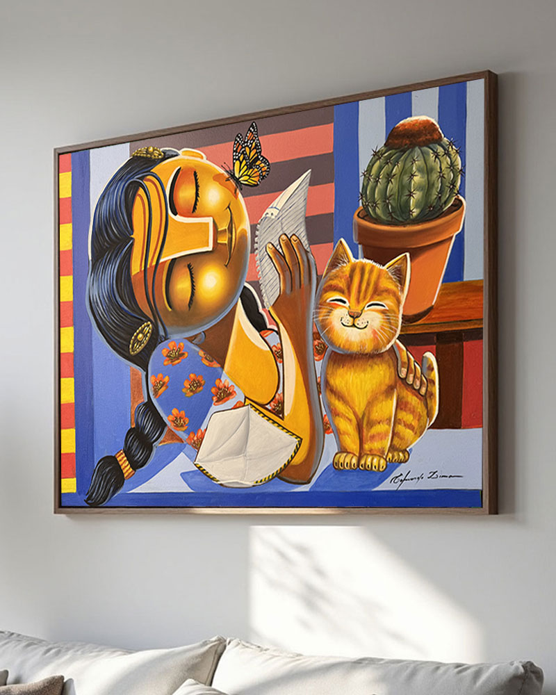 Na obra “A Carta”, Eduardo Lima revela a poesia dos pequenos gestos e da intimidade silenciosa. A personagem, de olhos fechados, lê com o coração antes mesmo de terminar a leitura, enquanto a borboleta pousada e o gato sereno ao lado reforçam a atmosfera de calma, afeto e contemplação. O cenário simples, com cores vibrantes e elementos do cotidiano, transforma o ato de ler uma carta em um momento de conexão profunda consigo mesma e com quem escreveu.