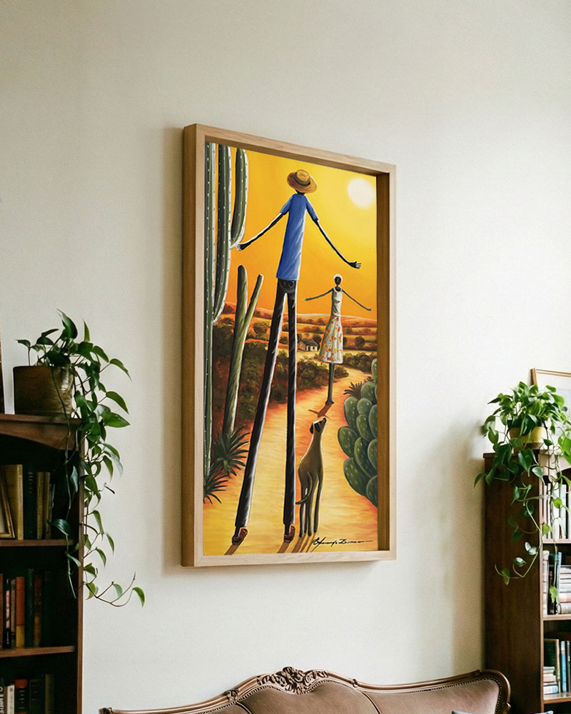 Na obra “De Volta ao Aconchego”, Eduardo Lima traduz em cores quentes e formas alongadas o sentimento profundo de retorno ao lar, ao afeto e às raízes. As figuras caminham juntas por uma estrada de terra iluminada pelo sol do sertão, sugerindo proteção, pertencimento e continuidade. O cenário, marcado por cactos e pela paisagem nordestina, cria uma atmosfera de calma e familiaridade, onde o tempo parece desacelerar e o essencial ganha protagonismo.