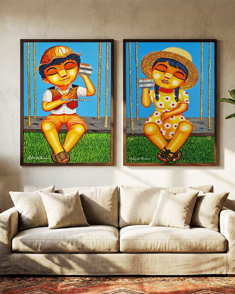 A obra Falando ao Coração e Ouvindo ao Coração, de Eduardo Lima, é uma composição sensível que traduz a essência do afeto, da escuta e da comunicação verdadeira. Com sua estética inconfundível, marcada por cores vibrantes, traços suaves e personagens de olhos fechados, o artista nos convida a um momento de pausa e introspecção. As figuras infantis, ligadas simbolicamente por fios e latas, evocam a simplicidade das brincadeiras de antigamente e, ao mesmo tempo, representam a profundidade do diálogo emocional: falar com sinceridade e ouvir com empatia.